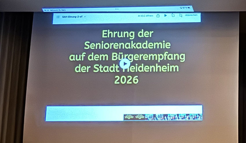 Außerdem konnten die Gäste den Film über die SAH ansehen, der anlässlich der Verleihung des Preises für das ehrenamtliche Engagement der Seniorenakademie beim Bürgerempfang der Stadt Heidenheim gezeigt wurde.