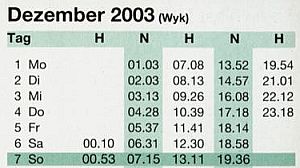 Der Gezeitenkalender von Wyk im Dezember 2003